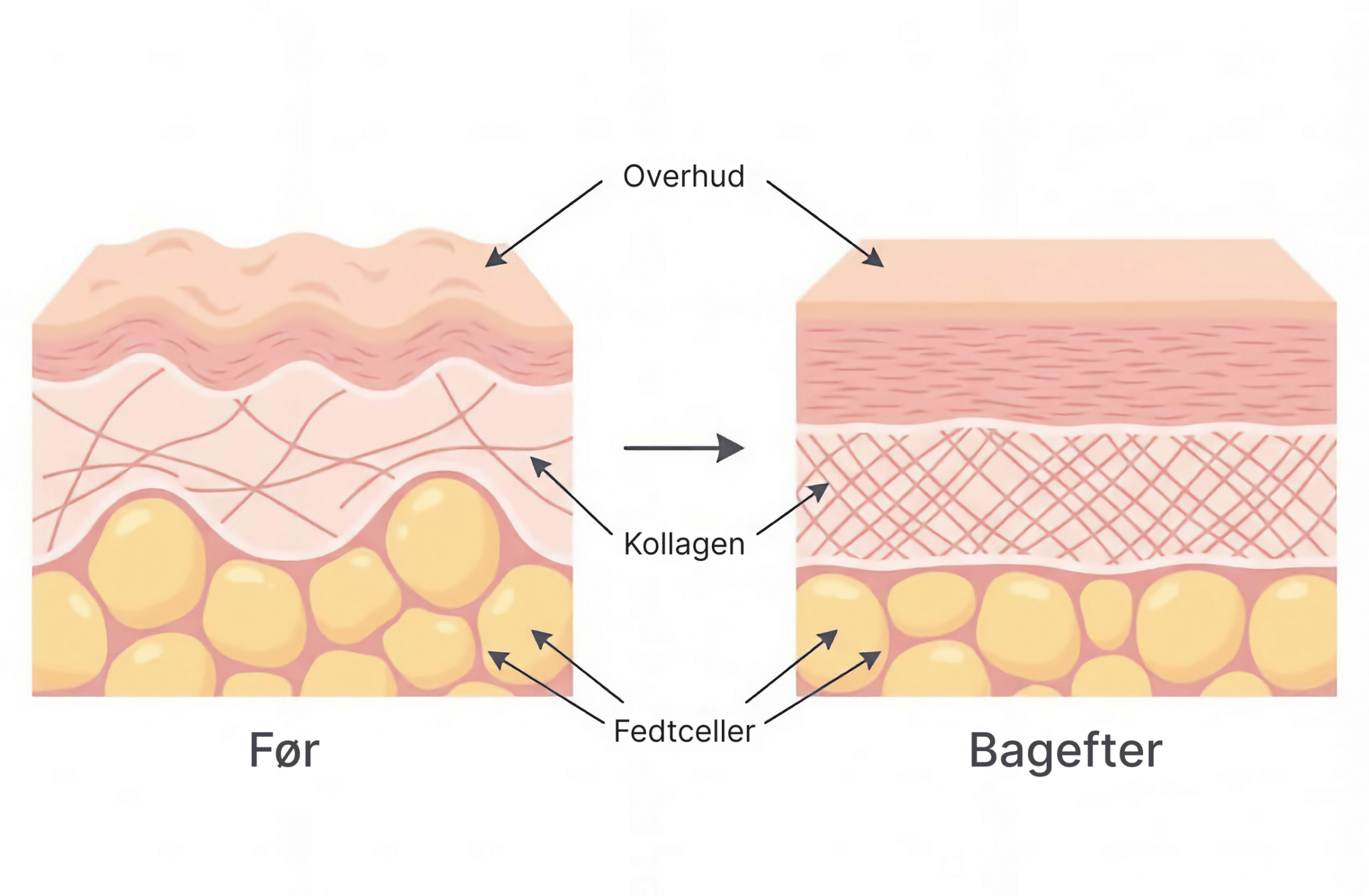 Bliver huden ovenpå tættere og mere modstandsdygtig, opfanger den bedre trykket nedefra. Overfladen fremstår glattere, fordi huden er stabil nok til ikke længere at lade ujævnheder skinne igennem.