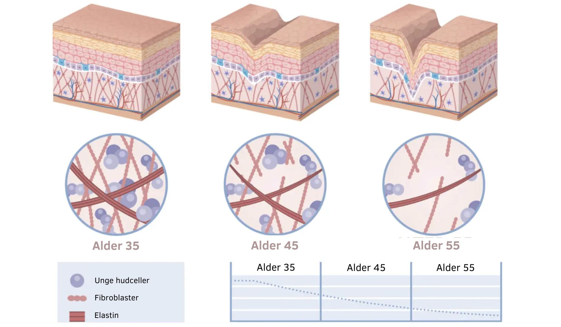 Allerede fra midten af 20’erne begynder huden at miste kollagen og elastin. Disse proteiner giver spændstighed og elasticitet. Uden dem mister huden sin fasthed – rynker og tunge øjenlåg opstår.