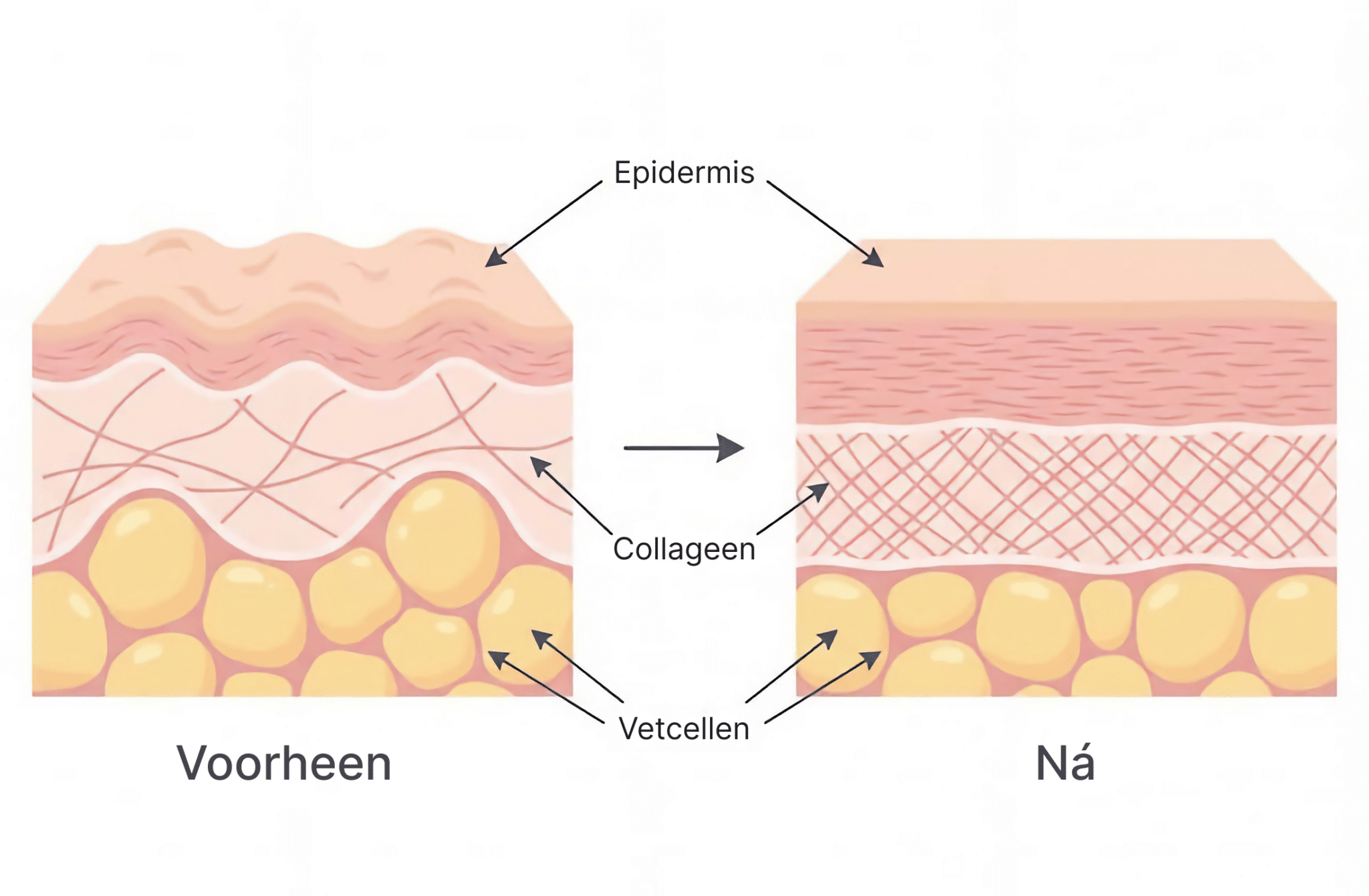 Wordt de huid erboven dichter en veerkrachtiger, dan vangt ze de druk van onderaf beter op. De oppervlakte lijkt gladder, omdat de huid stabiel genoeg is om oneffenheden niet meer door te laten schemeren.