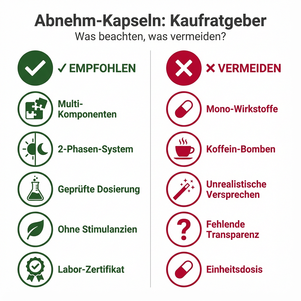Die besten Abnehm-Kapseln arbeiten nicht mit nur einem Wirkstoff, sondern kombinieren verschiedene Mechanismen: Stoffwechsel-Aktivierung + Sättigung + Nährstoff-Regulation. Diese 3-fache Wirkung ist deutlich effektiver als Mono-Präparate. Achte darauf, dass sowohl sättigende Ballaststoffe (wie Glucomannan) als auch stoffwechselaktivierende Vitamine (wie D3, K2) enthalten sind.